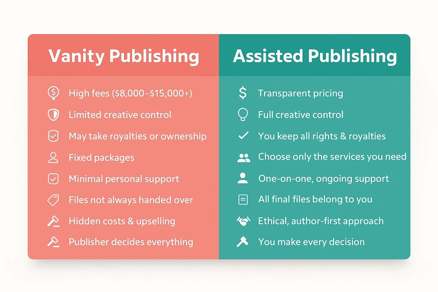 Unlike vanity publishing which charges a substantial fee upfront to get your book published the way they want it, assisted publishing asks the essential question: Is it ready to be shown to the world? And if it isn't, we help and guide you on how to get it there.